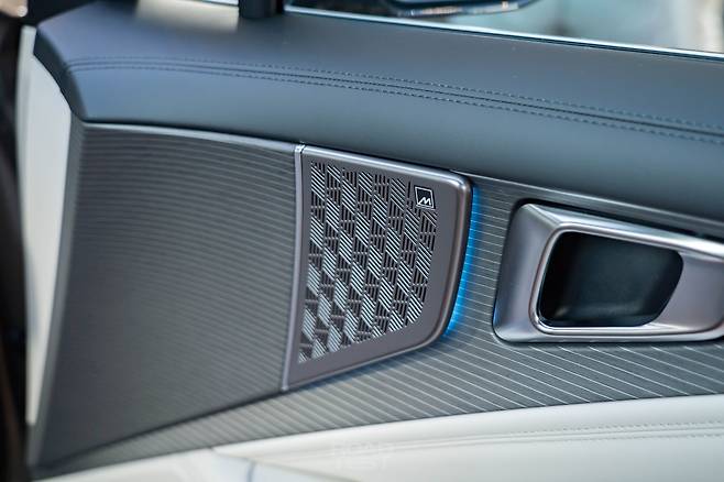 실내는 새로운 소재로 고급감을 높이고 수평적인 공간감과 우아한 조형미를 강조했다. 탑승객의 손이 닿는 크래시 패드 상단부와 무릎이 닿는 콘솔 하단 측면부에 부드러운 느낌의 소재를 적용했다. 크래시 패드 중앙에서 시작해 1열 양쪽 도어까지 승객을 감싸듯 이어지는 ‘실버 라이닝 다크 우드그레인 내장재’는 기하학적인 패턴의 스피커 그릴과 조화를 이루며 실내 고급감을 더한다.