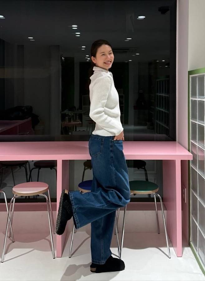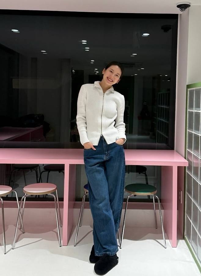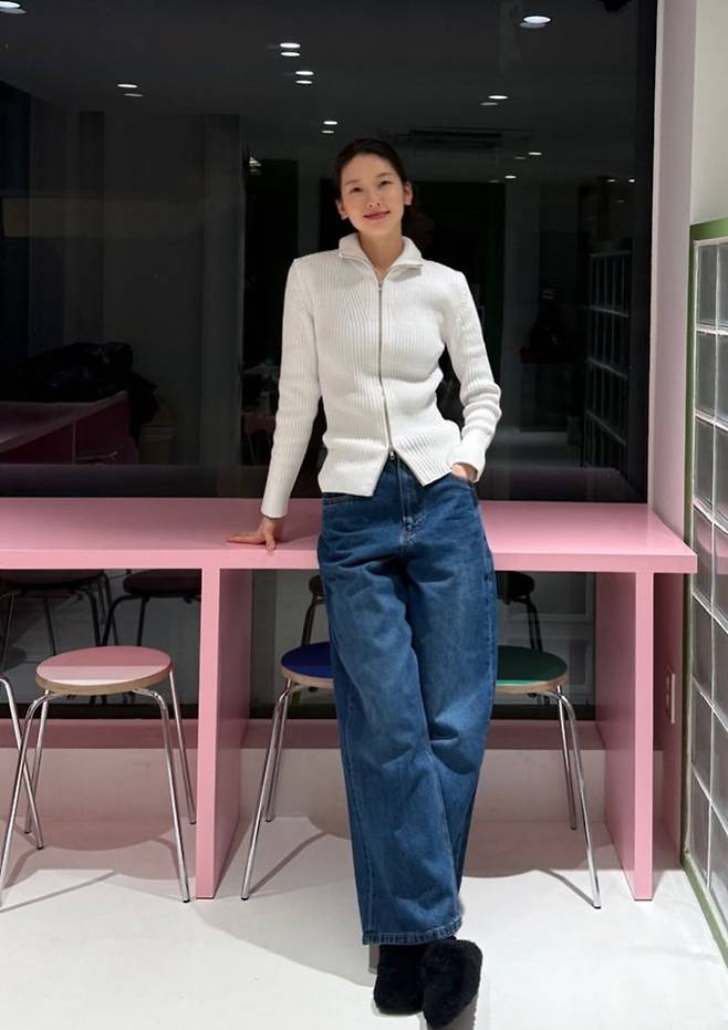 공개한 사진에서 김진경은 데님 팬츠와 화이트 니트 집업 카디건을 입고, 여기에 남편 옷을 입은 듯 오버핏 스타일의 블랙 가죽 재킷을 걸친 외출룩으로 시크하면서도 단정한 스타일을 완성했다.