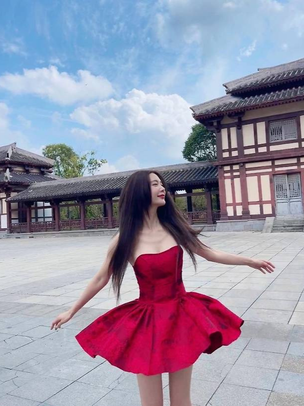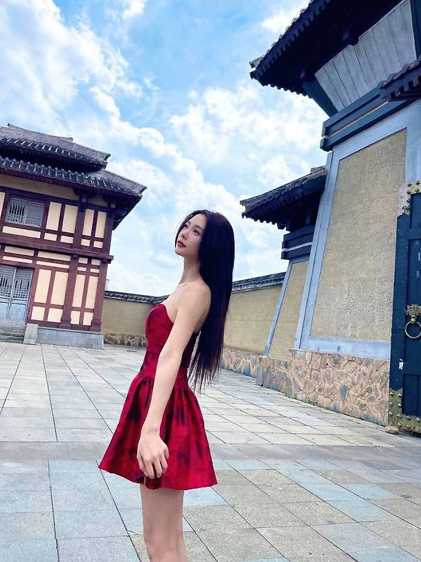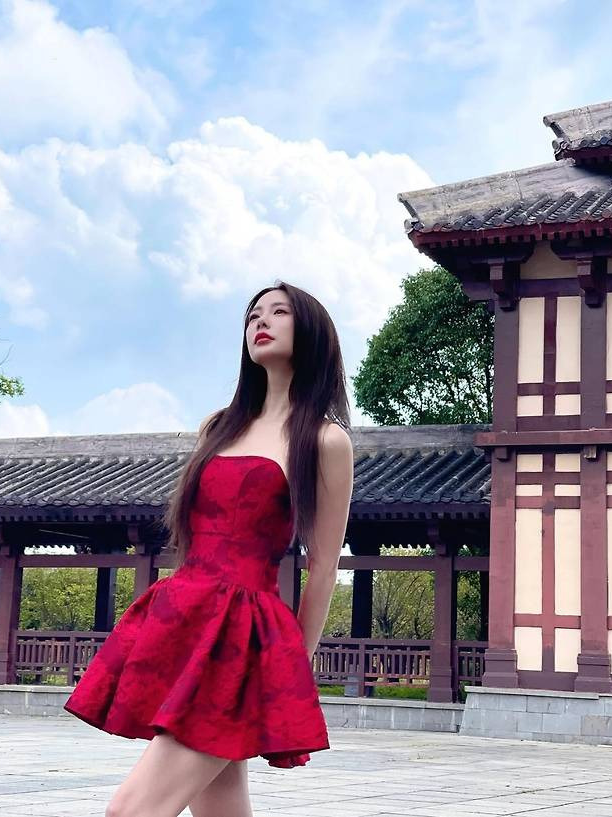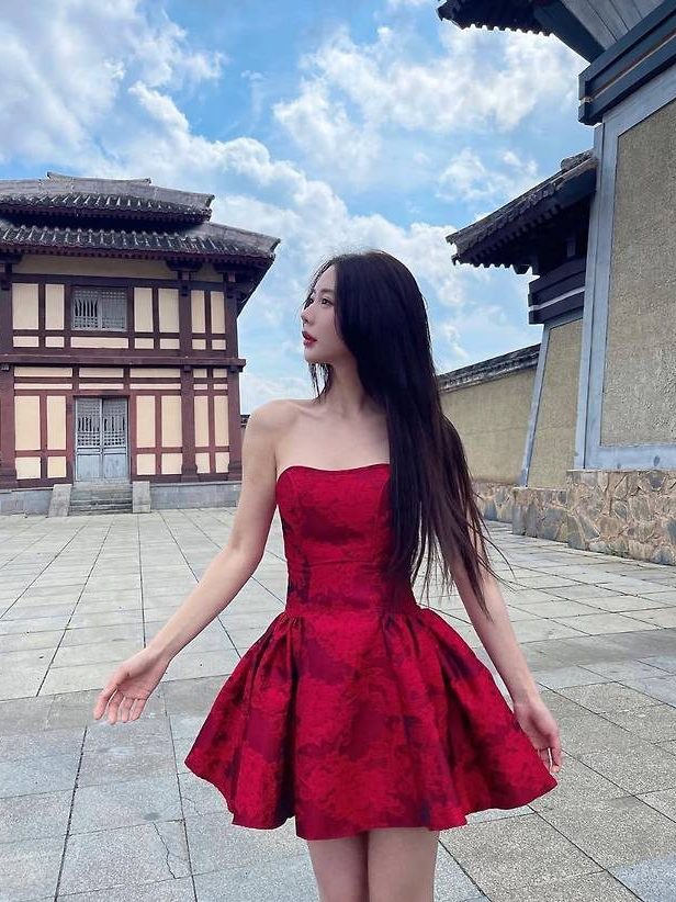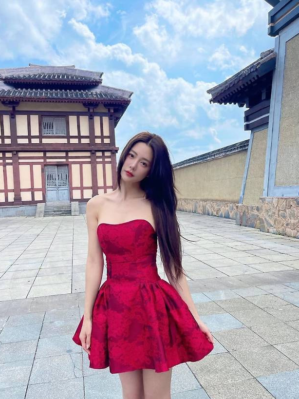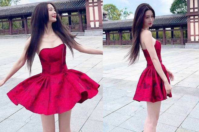 배우 클라라가 붉은 레이스 미니드레스를 완벽히 소화하며 세련된 분위기를 연출했습니다.