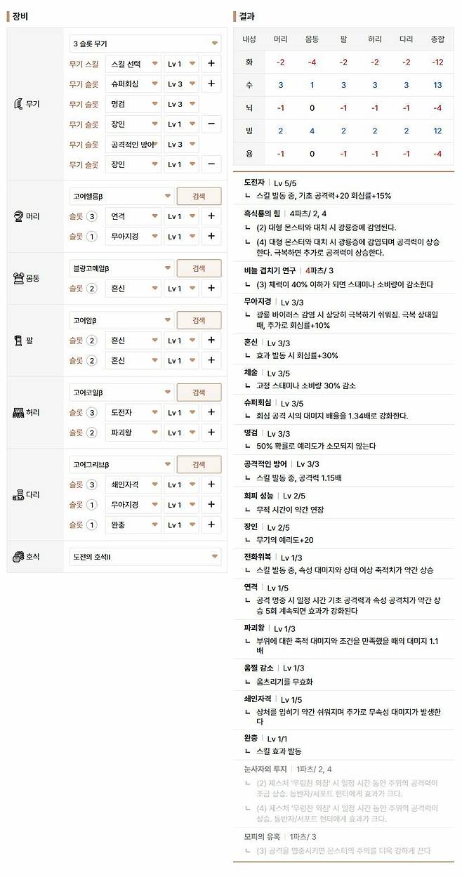 화력 증대를 위한 방어구 스킬은 도전자나 약점 특효로 정리되며 연타 능력을 살릴 수 있는 연격도 선호도가 높다. 속성 무기를 사용할 때는 연격에 조금 더 무게를 두기도 한다. 회심률을 챙길 수 있는 혼신을 가져가며 여유가 된다면 쇄인자격이나 파괴왕 등 상처 및 파괴와 관련된 옵션을 챙기기도 한다. 쇄인자격은 한손검과 궁합이 좋은 것으로 알려져 5레벨을 가져가는 케이스도 있다.