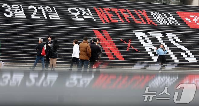 (서울=뉴스1) 김명섭 기자 = 15일 서울 종로구 세종문화회관 계단에 마련된 방탄소년단(BTS)의 컴백 라이브 공연 홍보물 앞에서 외국인 관광객이 기념촬영을 하고 있다. 약 3년 9개월 만에 컴백하는 방탄소년단(BTS)의 공연은 오는 21일 오후 8시 광화문광장에서 ‘BTS 컴백 라이브: 아리랑(ARIRANG)’이라는 타이틀로 개최된다. 2026.3.15/뉴스1