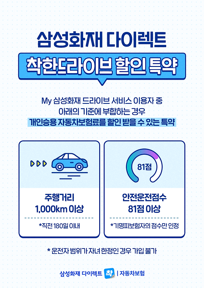 해당 서비스를 이용하여 직전 180일 이내에 1,000km 이상 주행하였고, 안전운전점수가 81점 이상인 경우 착한드라이브 할인 특약에 가입할 수 있어요. 단, 개인 승용 자동차보험에만 해당되고 운전자범위가 자녀한정인 경우는 가입이 불가하니 이 점 참고해주세요.