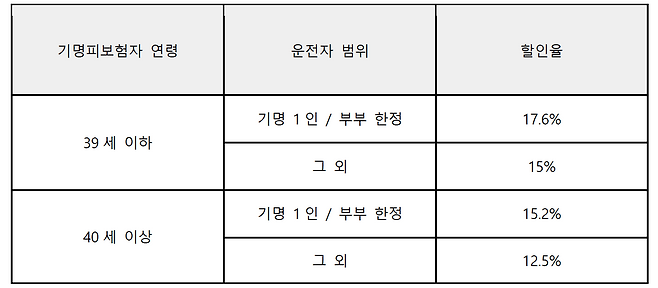 위 표에서 보듯 39세 이하의 경우 기명 1인 또는 부부 한정 17.6%, 그 외는 15%의 특약 할인율이 적용됩니다. 40세 이상의 경우 기명 1인 혹은 부부 한정 15.2%, 그 외는 12.5%의 할인율을 적용 받습니다. (‘25.11.16 보험시작일 기준)