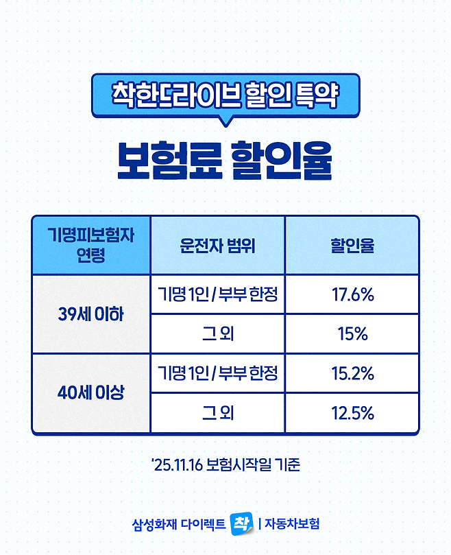 위 표에서 보듯 39세 이하의 경우 기명 1인 또는 부부 한정 17.6%, 그 외는 15%의 특약 할인율이 적용됩니다. 40세 이상의 경우 기명 1인 혹은 부부 한정 15.2%, 그 외는 12.5%의 할인율을 적용 받습니다. (‘25.11.16 보험시작일 기준)