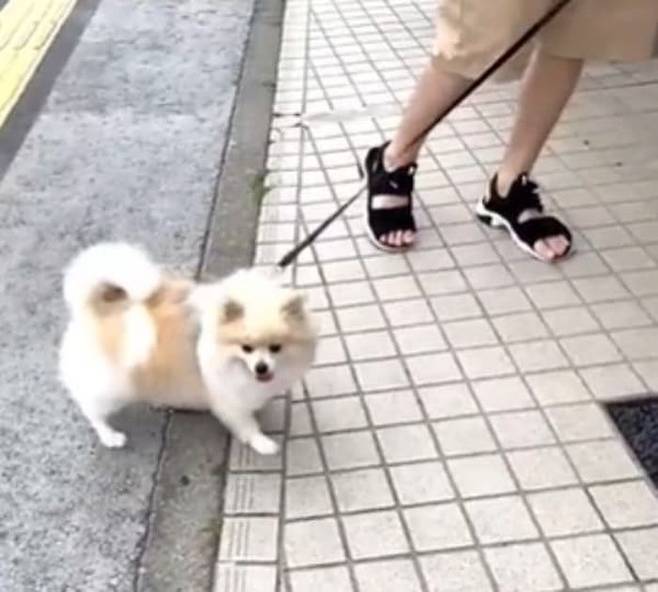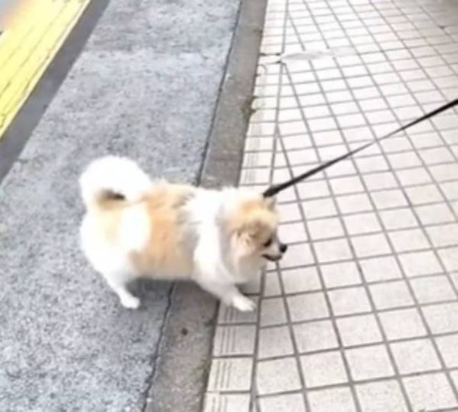 그렇게 산책을 즐기고 있던 그때 포메라니안 강아지는 도착지 앞에서 머뭇거리는 것은 물론 당황한 기색이 역력했죠.