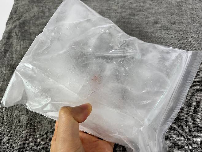 6시간 이상 충분히 얼린 후 꺼냈더니 단단한 얼음이 만들어졌습니다. 이 얼음 팩을 방망이 등으로 쳐서 얼음을 조각내세요.