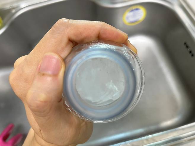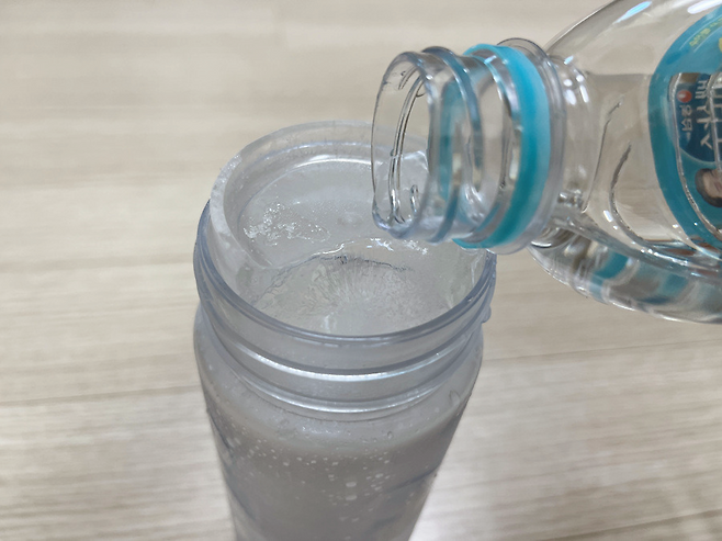 이제 빈 공간에 생수를 채워 넣으세요. 이렇게 하면 얼음물을 시원하게 마실 수 있습니다. 또는 기호에 따라 커피 등도 넣어서 차갑게 먹을 수 있습니다.