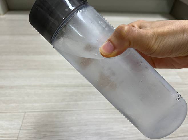 45도로 기울여서 열렸더니 이렇게 사선으로 얼음이 생겼습니다. 그리고 얼음이 입구를 막지 않아 쉽게 물을 넣을 수 있었습니다. 외출하기 전, 생수병 빈 공간에 차가운 물을 넣어보세요.