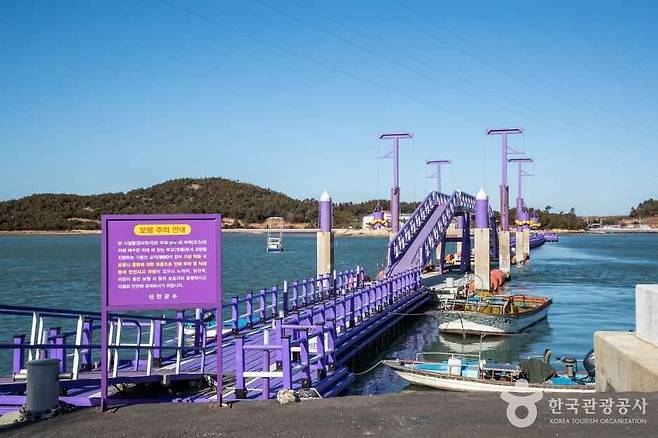 퍼플교는 안좌도 두리마을에서 박지도, 반월도를 차례로 잇는 해상 목교입니다. 안좌도~박지도 547m, 박지도~반월도 915m로 이어지며, 중간에는 팔각정 쉼터가 놓여 있습니다. 다리 위에 서면 만조 때는 바다 위를 걷는 느낌이, 간조 때는 갯벌의 결이 그대로 드러납니다. 그래서 같은 길을 걸어도 시간대에 따라 전혀 다른 인상을 남깁니다.