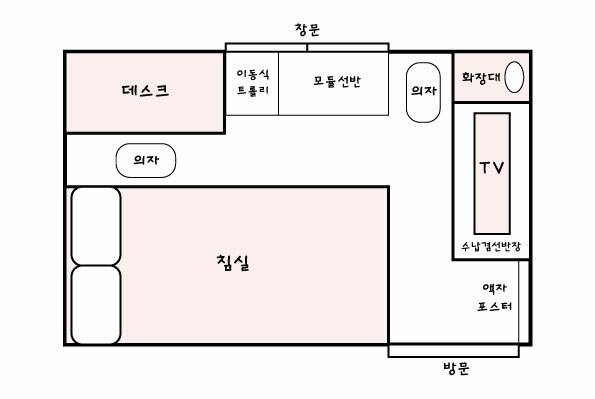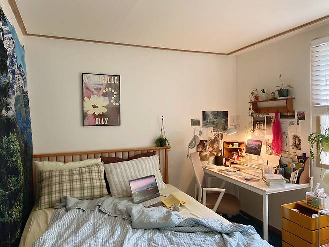 저는 룸메이트와 함께 살고 있고, 방 하나를 사용하고 있어요. 방의 구조는 직사각형이고 크게 침실, 데스크, 티비, 화장대 4개의 존으로 나눠서 배치했습니다. 데스크존에 가장 공들였고, 제가 좋아하는 물건들과 함께 작업 공간을 만들면서 더 애착이 가는 공간으로 재탄생했어요. 작은 방이지만 공간 분리와 수납이 용이하도록 구성해 봤습니다.