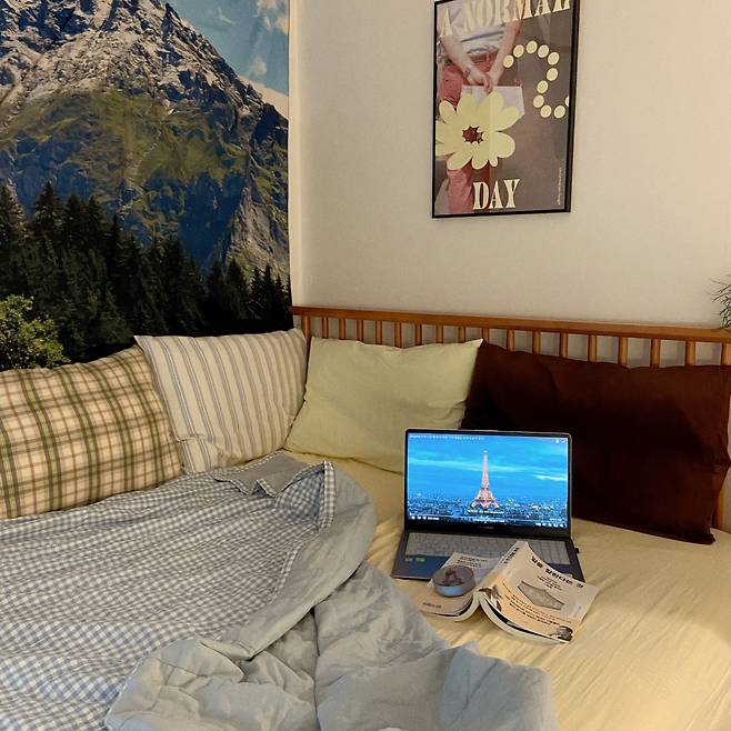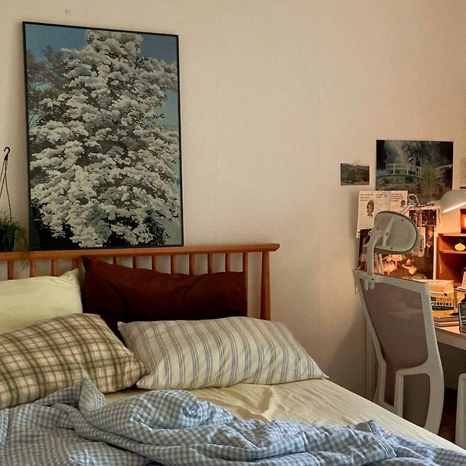침대 헤드 위에 큰 액자도 배치해 봤는데 생각보다 잘 어울리더라고요. 침실의 분위기를 바꿔주는 역할로 많이 사용하고 있어요. 액자 포스터는 여기저기 포인트 주기 좋아서 실용적인 아이템입니다.