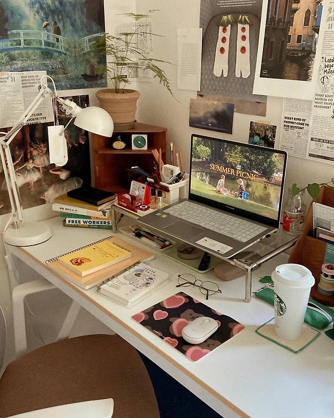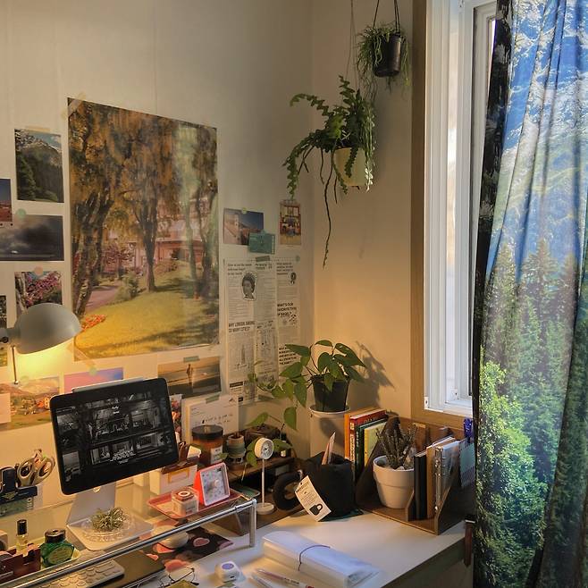 저는 데스크존에서 포인트를 줄 때 벽꾸미기를 활용합니다. 벽 꾸미기를 할 때는 포스터, 편집물, 엽서, 잡지 등을 사용하여 꾸며줍니다.