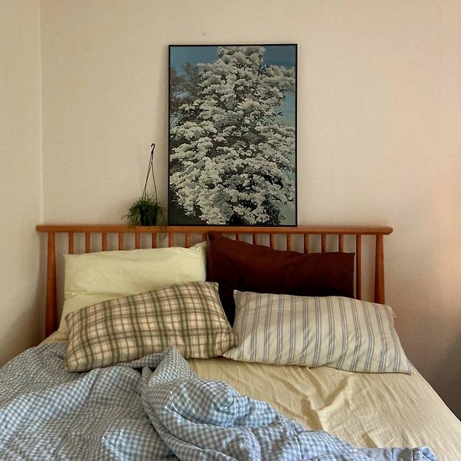 우드 침대 헤드에 여름 분위기를 내고 싶어 노란색과 하늘색이 어울리는 베딩으로 구성해 보았어요.
