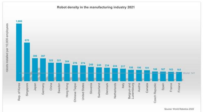 국제로봇연맹(IFR : International Federation of Robotics)가 산업용 로봇에 대한 중국의 막대한 투자로 처음으로 미국을 제치고 5위에 올랐다고 발표했다. 중국은 2021년 국가 및 지역별 로봇 밀도(근로자 10,000명당 작동 중인 로봇 수) 322대를 기록했다고 밝혔다. 2021년 기준 제조업에서 가장 자동화 지수가 높은 국가는 한국과 싱가포르, 일본, 독일, 그리고 중국이었다.