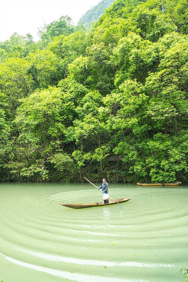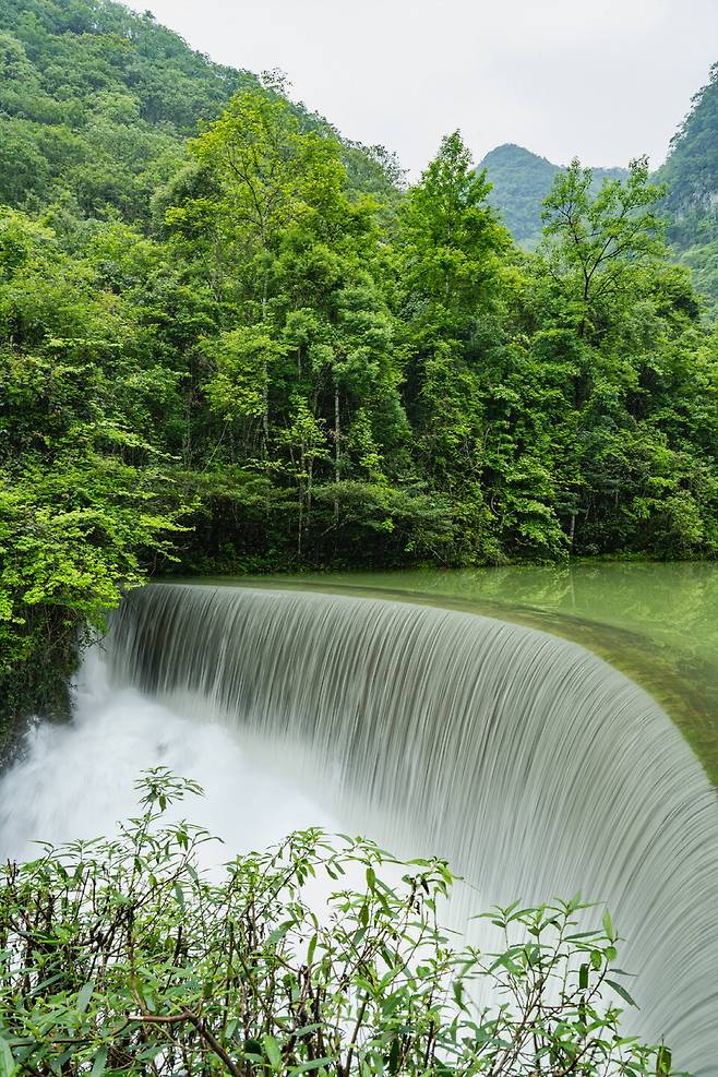 와룡담 풍경구 상류에 있는 호수. 고인 듯 잔잔하게 흐르던 물길은 또 다른 폭포를 만나 아래로 쏟아진다. 울창한 나무와 식물들 군데군데 솟아난 지형들은 마치 섬을 떠올리게 한다. 소칠곡풍경구를 '분재'라 부르는 이유에 진심 동감하는 순간들이었다. 소칠공의 백미는 찬란한 물빛이라는데, 다소 흐린 날씨 때문에 걱정이 있었다. 그런데 역시 소칠공은 소칠공이다. 담대하게 흘러내린 초록 물빛, 찬란함 대신 신비함이라니.
