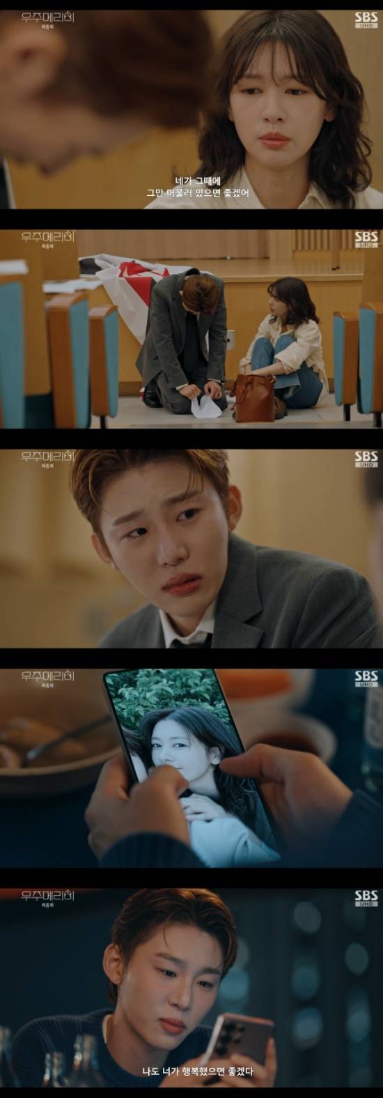 이어 우주는 홀로 술잔을 기울이면서 유메리와의 추억이 담긴 사진을 살펴봤다. 사진 속 행복한 모습을 보며 우주는 "벌 받는건가? 좋았던 시절 다 보내고, 메리 같은 여자도 놓치고...메리야 미안해. 늦은 거 아닌데 미안하다는 말은 진심이야. 나도 너가 행복했으면 좋겠다"라고 유메리의 행복을 빌었다.