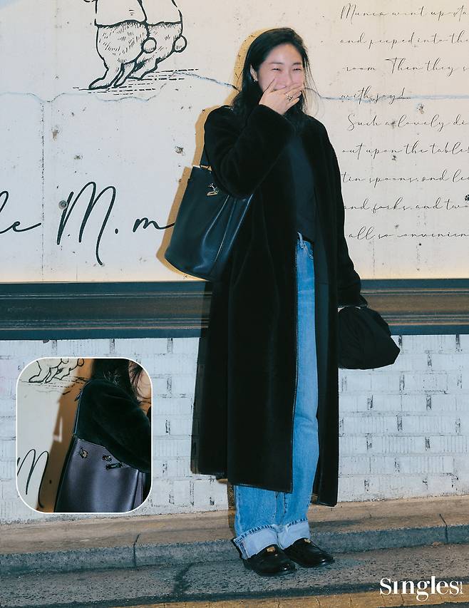 아우터는 LE17SEPTEMBRE, 니트 톱은 EAST HARBOUR SURPLUS, 데님 팬츠는 LEVIS, 슈즈는 Miu Miu, 백은 HERMÈS.