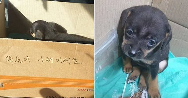 박스 겉면에는 '똑순이 가져가세요'라는 글자가 선명하게 적혀 있었습니다. 그 안에는 태어난 지 고작 한 달 남짓 된 작은 강아지가 추위와 공포에 질려 벌벌 떨고 있었습니다.