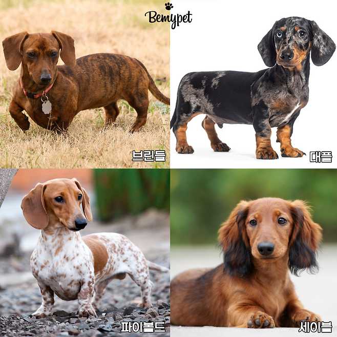 닥스훈트는 앞서 설명한 털의 형태뿐만 아니라, 색상과 무늬에 따라 여러 종류로 구분할 수 있어요.