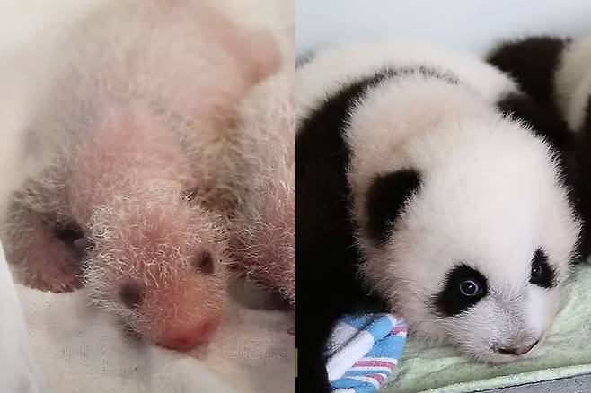 생후 5일째와 100일째를 비교한 사진이에요. 3달 만에 훌쩍 큰 아기판다입니다.