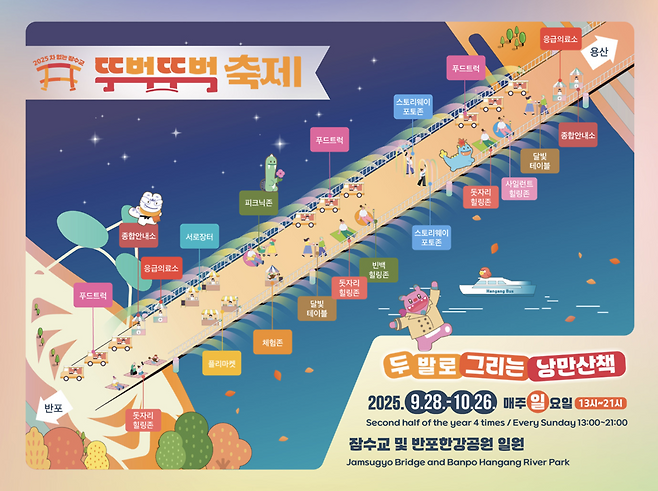 반포대교 아래 잠수교가 매주 일요일마다 보행자에게만 열리는 특별한 길로 변신합니다. ‘차 없는 잠수교 뚜벅뚜벅 축제’는 자동차 대신 사람의 발걸음으로 채워지는 서울의 대표 가을 행사죠. 푸드트럭, 라이브 공연, 플리마켓 등 다양한 볼거리와 먹거리가 함께하고, 무엇보다 한강 위를 걸으며 맞는 바람이 참 좋습니다.