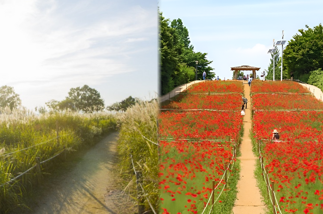 단풍이 들기 전, 가을을 가장 먼저 느낄 수 있는 곳은 올림픽공원 들꽃마루입니다. 황화 코스모스가 활짝 피는 길을 따라 걷다 보면 자연스레 미소가 지어질 만큼 평화로운 분위기가 흐르죠. 들꽃마루는 위쪽에서 아래로 내려다보는 경사형 꽃밭이라, 사진 찍을 때 인파를 자연스럽게 가릴 수 있어 인생샷 명소로도 유명합니다.