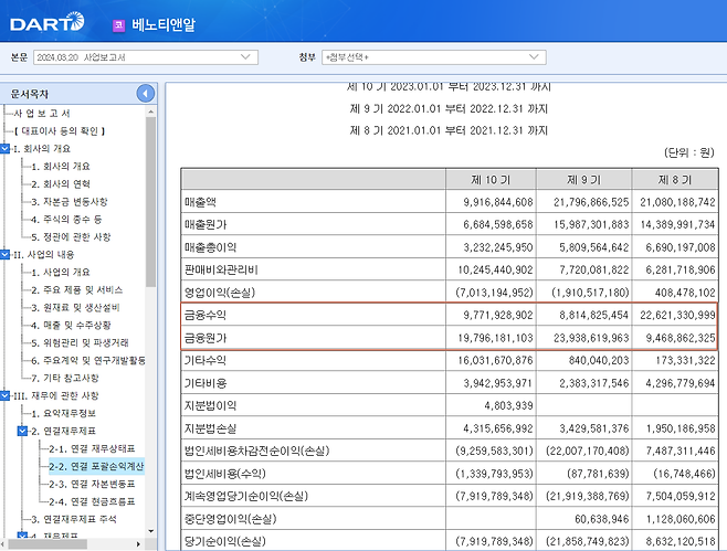 실제로 2022~2023년 손익계산서에서 본연의 사업 성적을 나타내는 영업이익은 적자를 기록하고 있지만, 금융자산평가이익과 관계기업투자처분이익 등 금융수익과 금융비용의 손익은 영업손실 규모를 훨씬 넘기고 있다.