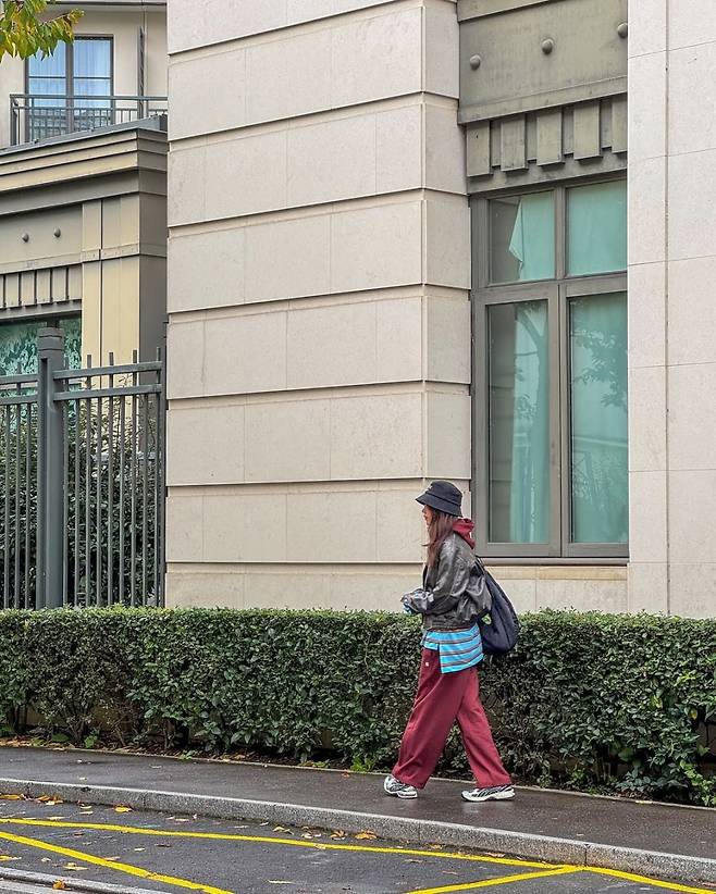그녀의 특유의 스타일리시한 감각을 보여줍니다. 여기에 버킷햇과 컬러 레이어링 디테일이 더해지면서 "조거팬츠도 이렇게 멋질 수 있구나"를 입증해주는 순간이죠.