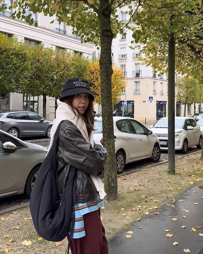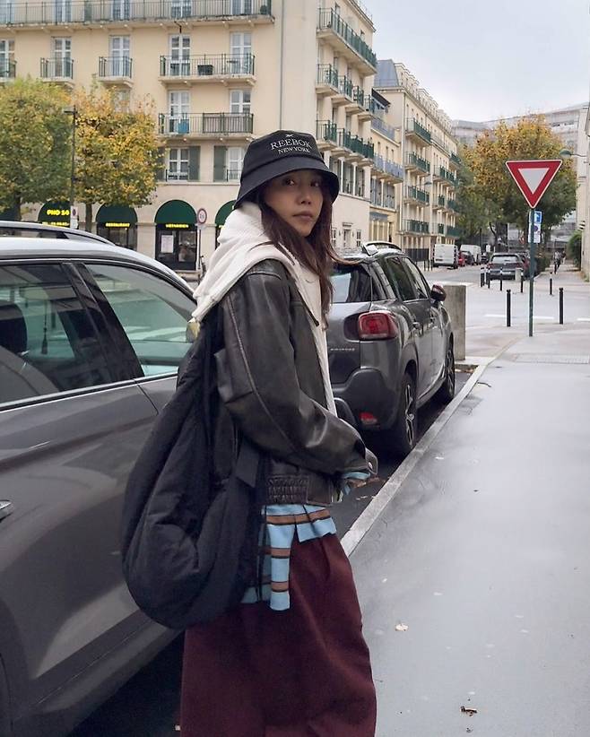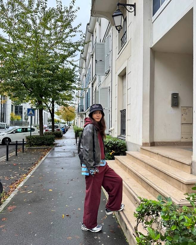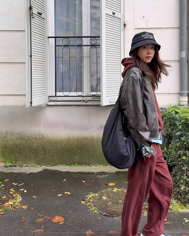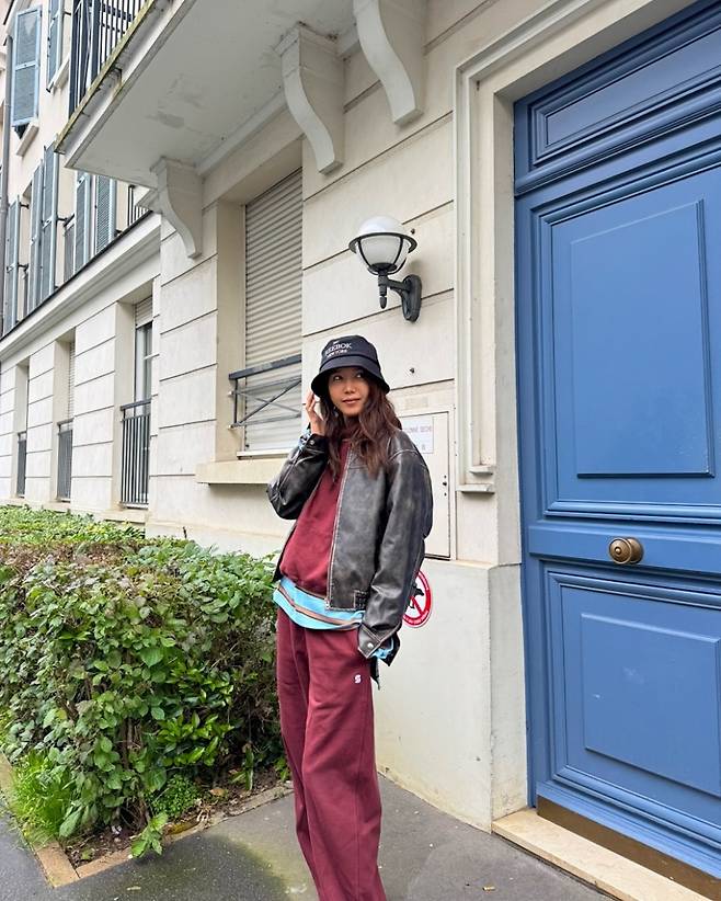 파리의 어느 조용한 골목, 채정안은 트렌디하면서도 편안한 룩으로 거리를 빛내고 있습니다. 가죽 재킷과 버건디 조거팬츠의 조화는 단순한 운동복을 넘어 세련된 스트릿 무드를 완성하며