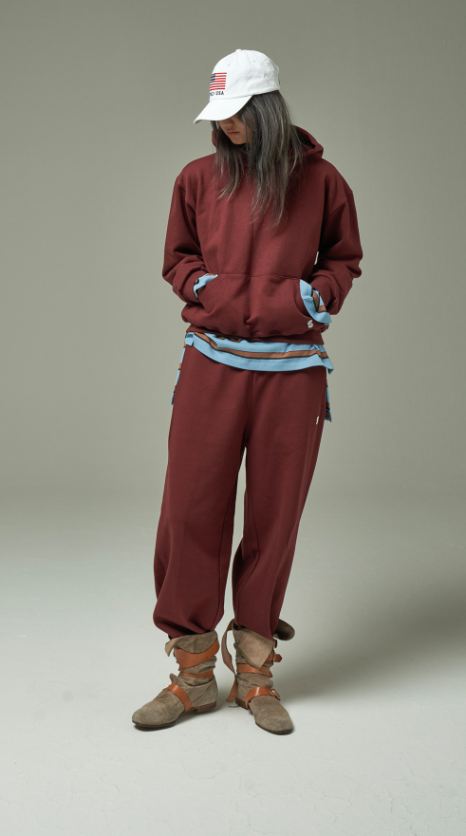 발목 밴딩 디테일은 깔끔한 핏을 완성하며 전체적으로 여유로운 실루엣 덕분에 누구나 편하게 착용할 수 있어요. 색감은 단조롭지 않은 버건디 컬러로