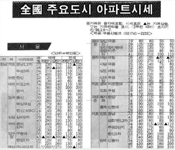 서울 강남·비강남 아파트 실거래 가격이 역대급으로 차이가 나면서 과거 신문기사로 소개된 ‘1996년 서울 아파트 시세’ 자료가 재조명받고 있다. 현재 서울 아파트 가격과 비교하면 소위 ‘껌값 수준’으로 저렴해 사람들에게 충격을 주고 있어서다. 더군다나 지금과 달리 강남3구(강남·서초·송파구) 핵심지역 아파트 가격이 주변 지역 집값과 별 차이 없거나, 오히려 저렴한 사례도 적지 않아 눈길을 끈다.