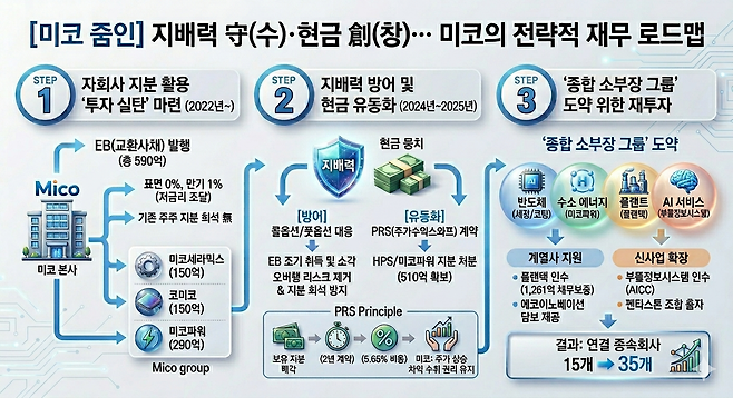 미코의 전략은 자회사 지배권 훼손을 최소화해 대규모 투자를 집행하고, 계열사 확장을 병행하는 구조라는 점에서 자본 효율성이 높다는 평가를 받는다.