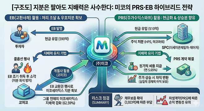 처분 과정에서 PRS(주가수익스와프) 계약도 맺었다. 보유 지분을 매각하되 향후 주식 가치가 상승하면 그 차익을 미코가 돌려받고, 반대로 하락할 경우에는 이를 보전해주는 파생계약이다. 미코는 현금을 확보하는 동시에 연 5.65% 수준 비용을 부담하며 주가 상승 차익을 돌려받는 구조를 설계했다. 계약 기간은 2년으로 2027년 11월28일까지다.
