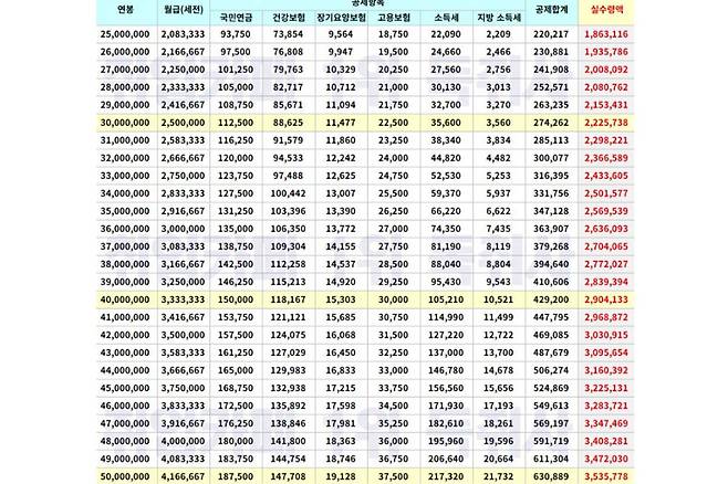 국세청이 공개한 2022년 귀속 연도 평균 연봉인 약 4,000만 원에 대한 2024현재 실수령액은 월 290만 원 수준이다. 이어 연봉 5,000만 원일 경우 실수령액 월 353만 원, 연봉 6,000만 원일 경우 월 416만 원을 수령한다. 세부 항목으로 부양가족 책정 등 개인마다 다르지만, 국민연금·건강보험·장기 요양보험·고용보험·소득세·지방소득세 등 약 10% 수준의 세금이 공제된다.
