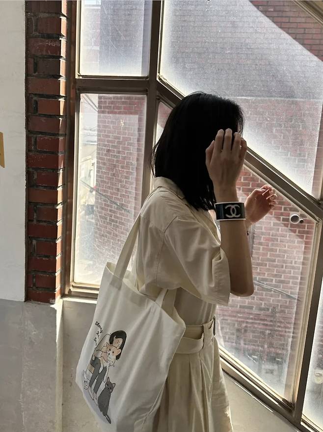 여기에 어깨에 가볍게 걸친 일러스트 프린트 에코백은 위트 있는 포인트가 되었습니다.