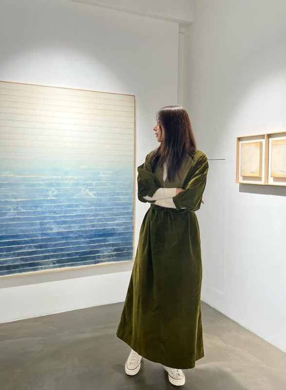 조윤희는 카키색 롱 원피스에 스니커즈를 신어 편안하고 활동적인 나들이룩을 선보였다.