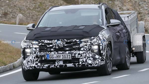 현대차 준중형 SUV 투싼이 부분변경을 앞두고 유럽에서 위장막을 쓴 채 포착됐다. 트레일러를 결합해 주행하는 것으로 보아 견인력 테스트가 한창인 것으로 보인다.