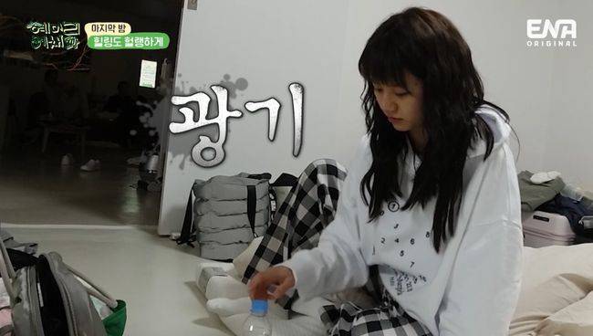 혜리는 물병 던지기 미션을 성공하고 싶은 마음에 광기 어린 집착을 보였다. 혜리의 광기는 결국 페트병이 깨지는 상황에 이르러서야 멈췄다. 자려고 누운 혜리와 미연은 “채원이에게 귀엽다고 하면 ‘안 귀여운데’라고 하는 반응이 너무 귀엽다”라며 채원에게 장난을 쳐 웃음을 줬다.