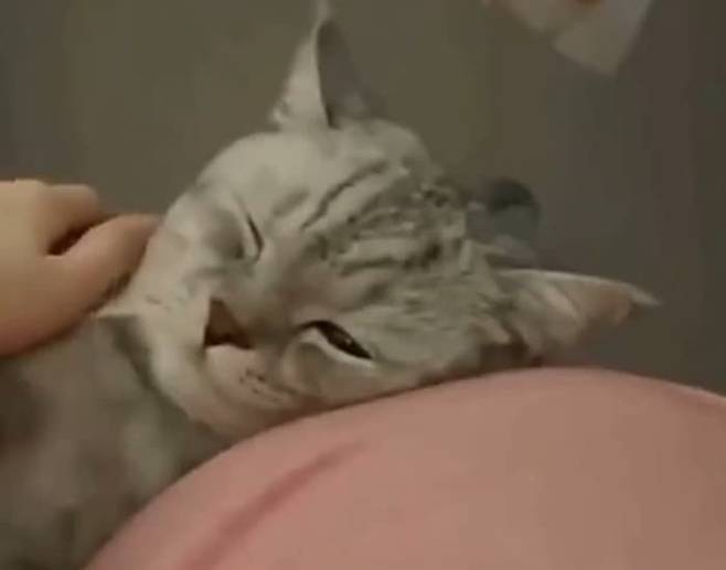알고보니 엄마의 배속에서 꿈틀거리는 태동을 느낀 것. 고양이가 엄마 배에 얼굴을 기대고 있던 그때 때마침 태아가 움직인 것입니다.