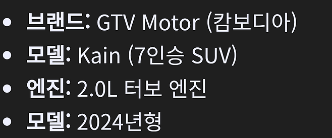 이런나라에서 2023년도에 설립한 자동차 회사인 GTV모터스라는 곳에서 내놓은 kain이라는 7인승 SUV의 모습...