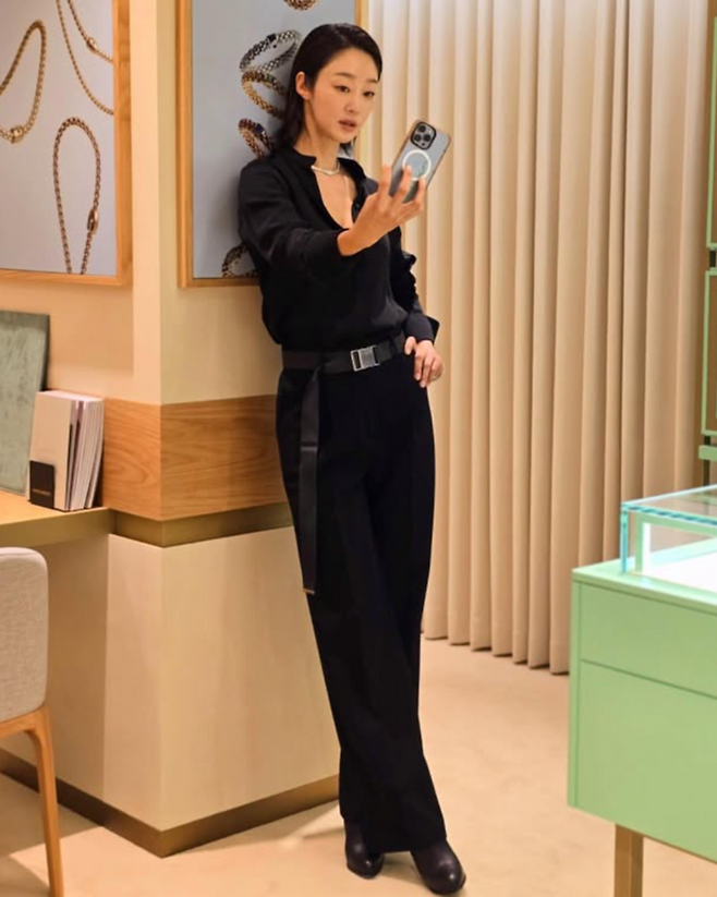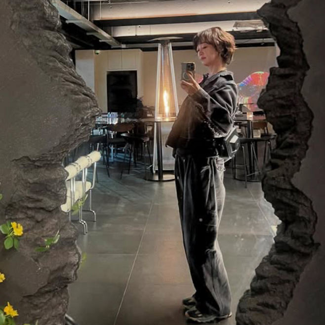 상하의 모두 올블랙으로 스타일링한 모습인데요.