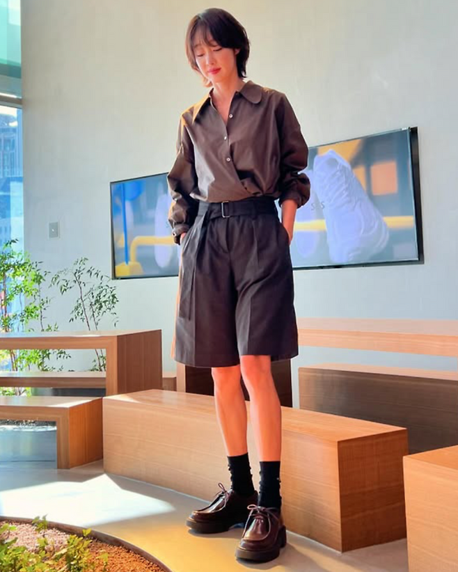 셔츠와 팬츠를 착용한 룩도 잘 어울리네요.