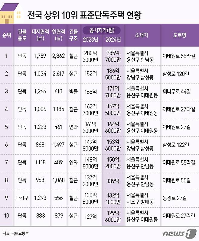 (서울=뉴스1) 양혜림 디자이너 = 국토교통부가 20일 공개한 2024년 표준지 공시가격(안)·표준주택 공시가격(안)에 따르면 내년도 표준단독주택(표준주택) 공시가격 1위는 서울 용산구 이태원로55라길에 위치한 단독주택으로, 공시가 예정액은 285억7000만원이다. 이명희 신세계그룹 회장의 집으로 알려진 해당 주택은 9년째 표준주택 공시가격 1위를 지켰다.