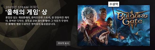 먼저, 지난해 최고의 게임을 선정하는 '올해의 게임' 상에는 라리안스튜디오의 CRPG '발더스 게이트 3'가 수상했습니다.