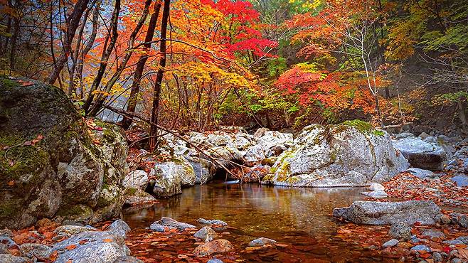 깊은 산자락에 안긴 비수구미마을은 가을이 오면 한 폭의 수채화로 변합니다. 붉고 노란 단풍이 계곡을 타고 흐르며, 호수와 숲이 빚어내는 풍경은 세상과 단절된 듯 고요합니다.