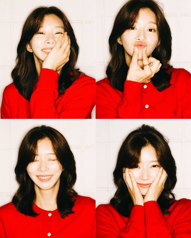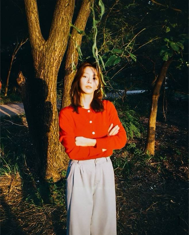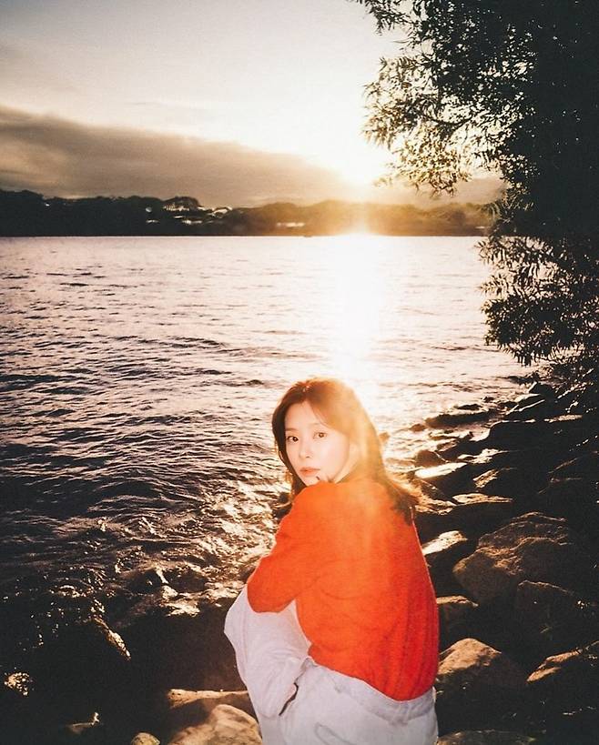 선명한 레드 카디건은 저녁 노을의 색감과 자연스럽게 어우러지면서 얼굴을 환하게 밝혀주고,