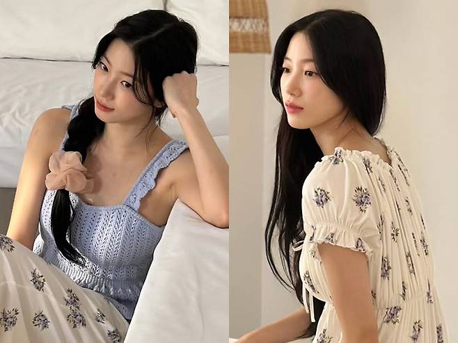 사진 속 카즈하는 화이트톤의 니트 셋업을 입고 청순한 매력을 발산하고 있다. 또 다른 사진에는 반팔 롱 원피스를 착용하고 긴 머리를 늘어뜨린 채 아련한 눈빛을 하고 있다.
