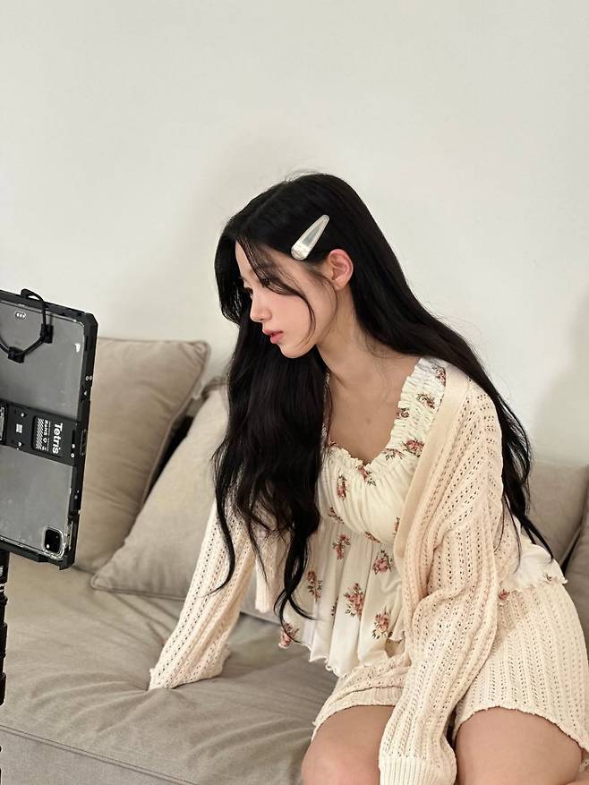 니트 톱에 편안한 바지를 입고 바닥에 주저앉아 찍은 사진은 꾸밈없는 소녀같은 매력을 돋보이게 한다.