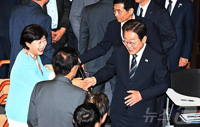 (서울=뉴스1) 국회사진기자단 = 이재명 대통령이 26일 국회에서 추가경정예산안 시정연설을 마친 뒤 서영교 더불어민주당 의원과 악수하고 있다. 2025.6.26/뉴스1