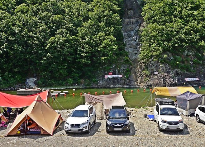 특히 인공으로 조성된 청룡폭포 앞은 뷰가 좋기로 소문나 있으며, 물가 바로 옆으로 차량 진입이 가능해 강변 차박도 가능하다. 바닥은 자갈이 섞여 있어 평평하진 않지만, 이미 캠퍼들이 다듬어놓은 자리들이 많아 초행자라도 큰 어려움 없이 자리를 잡을 수 있다.